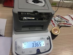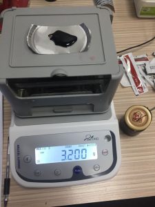 - 將2號阿膠膏體液置于稱重臺上,屏幕出現(xiàn)空氣中阿膠液的重量為3.365,按MODE鍵,就記錄了阿膠液在空氣中的重量了。