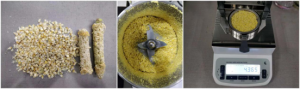 - 將玉米一粒粒掰開,放入攪拌機(jī)中進(jìn)行攪拌,充分?jǐn)嚢璩捎衩酌婧?,用?shí)驗(yàn)勺取365g玉米面均勻鋪在樣品盤上,設(shè)置好合適的溫度后蓋下上蓋,按下“START”鍵開始測(cè)試;蜂鳴兩聲后,儀器自動(dòng)停機(jī),測(cè)試結(jié)束,可在液晶顯示屏查看測(cè)試后玉米面的水含量為47.02%;