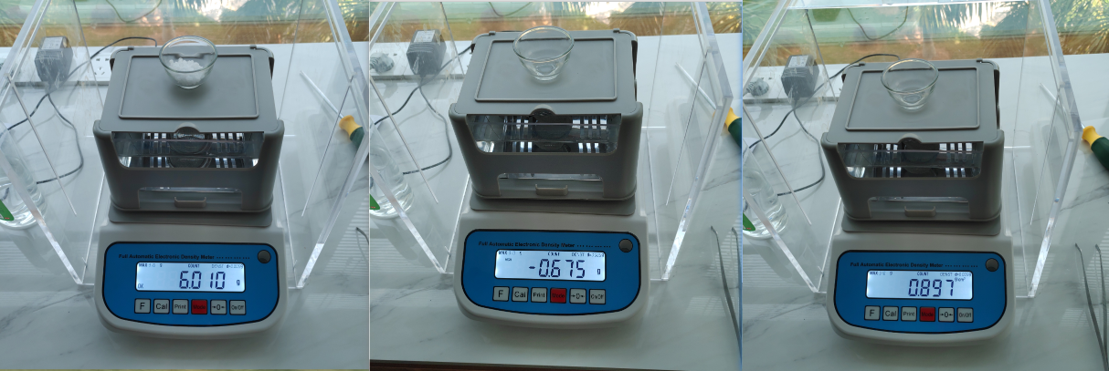 - 將塑料顆粒(樣品1)放在架子上面顯示空氣中的重量615g,然后按mode鍵記錄下重量,再將塑料顆粒放入水中顯示水中重量0.670g,按下mode鍵記錄下重量。顯示密度值0.893g/cm3。