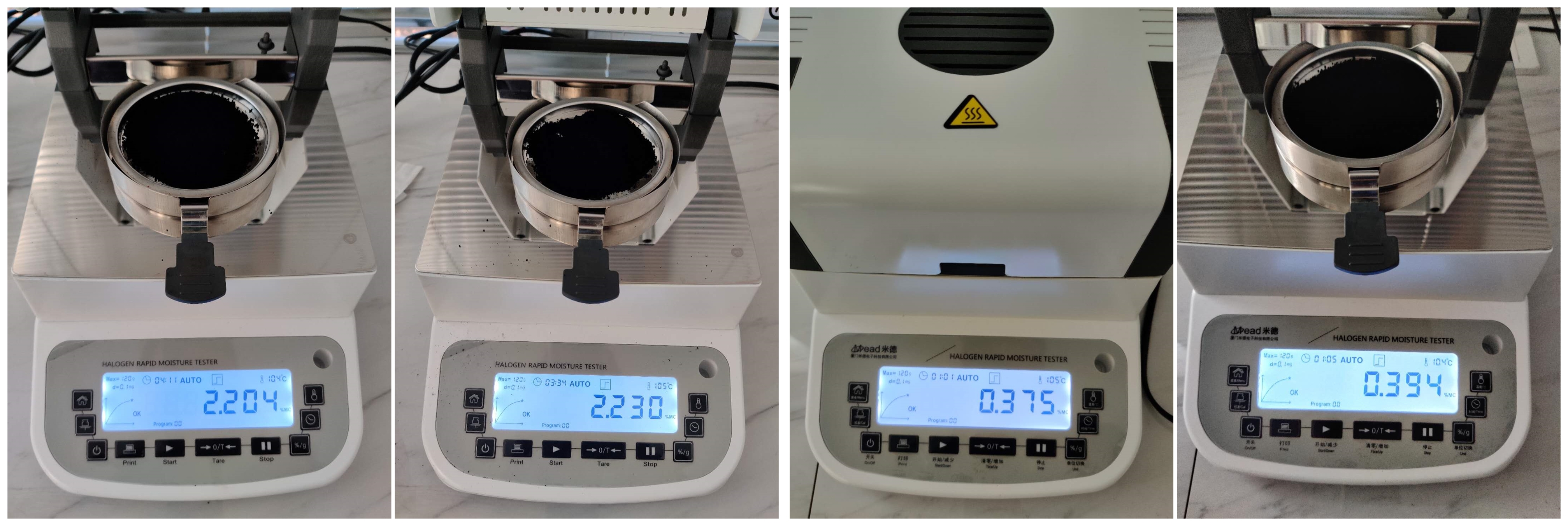 - 用樣品勺取適量充分暴露在空氣中的碳黑粉末均勻鋪在樣品盤上,設置好合適的溫度后蓋下上蓋,按下“START”鍵開始測試;蜂鳴兩聲后,儀器自動停機,測試結(jié)束,可在液晶顯示屏查看被測粉體的水分含量為2.204%;