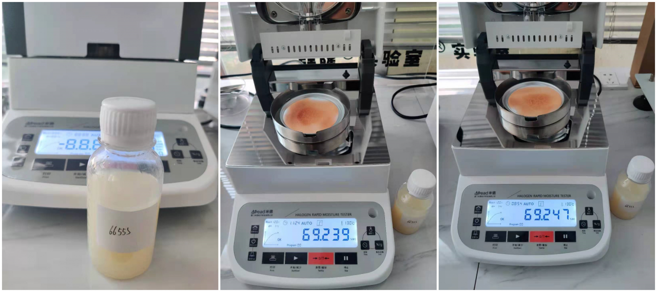 5、復(fù)位儀器,待儀器冷卻至40℃以下后,再取等量的溶液1均勻滴在玻璃纖維紙上,重復(fù)上述測試步驟;測試結(jié)束后得出第二組數(shù)據(jù),顯示樣品的揮發(fā)物為69.247%,固含量為30.753%;兩次測試誤差為0.008%,表示測試結(jié)果可靠,可重復(fù)性好。