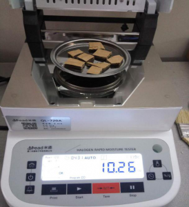 測試樣品:剪取2克紙皮,置于不銹鋼托盤中,將紙皮平鋪均勻,溫度設(shè)置120℃用儀器進(jìn)行加熱,約5分鐘后檢測結(jié)束,檢測數(shù)據(jù)顯示10.26%;