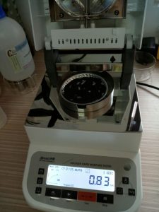 - 為了得到更精確穩(wěn)定的數(shù)據(jù)結(jié)果,在進行第二次測試過程前先等待稀土水分測試儀降溫,待水分儀本身冷卻至40度以下時,同樣取1克多稀土于不銹鋼托盤中,將稀土平鋪均勻,這次我們把溫度設(shè)定在100℃,按“START”鍵開始測試,1分35秒后檢測結(jié)束,檢測數(shù)據(jù)顯示0.83%;