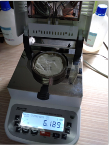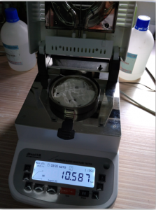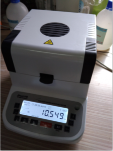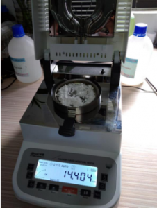 - 測試混合淀粉:為了使測試過程中混合淀粉水分儀將混合淀粉烘干烘透,我們將混合淀粉攤成分散狀,以便溫度能滲透進去。取5克左右混合淀粉末置于不銹鋼托盤中,用鑷子將混合淀粉末平鋪均勻,為避免混合淀粉烘烤后變焦,我們將溫度設置在135℃,按“START”鍵開始測試,7分55秒后檢測結束,檢測數據顯示14.404%;