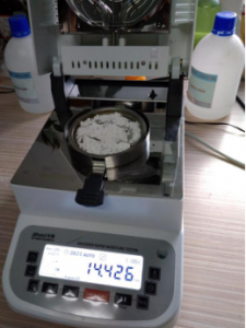 - 為了得到更精確穩(wěn)定的數據結果,在進行第二次測試過程前先等待混合淀粉水分儀降溫,待儀器本身溫度降至40度以下時,同樣取5克左右混合淀粉末于不銹鋼托盤中,將混合淀粉末平鋪均勻,這次我們把溫度設定在135℃,按“START”鍵開始測試,8分23秒后檢測結束,檢測數據顯示14.426%;