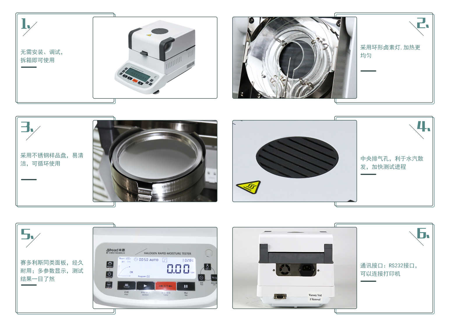 1.代替國標烘箱法,用途非常廣泛、適合各行業(yè)的水分測定;